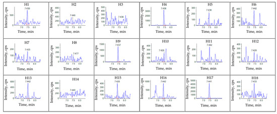The developed and validated method was applied to detect and quantify the 10 selected flavonoids in 18 samples of Sanghuangporus (Table 3). The quantitative results of the quercitrin, myricitrin, kaempferol, luteolin, rutin, hyperoside, and kaempferol-3-O-rutinoside in each sample are presented in Table 4. There were extremely low concentrations detected for the other three compounds, sakuranetin, catechin, and catechin gallate. Based on the sample results, it is evident that Sanghuangporus contains relatively low amounts of myricitrin, kaempferol, luteolin, hyperoside, and kaempferol-3-O-rutinoside. In contrast, the levels of rutin and quercitrin are relatively high. Rutin is often used as a standard substance for determining total flavonoid content. The extracted mass spectrum (XIC) area of rutin in 18 samples can be seen in Figure 4. Sample H11 especially showed a range of 8.5 ng/g, but the chromatographic separation effect was still good, indicating the high sensitivity of this method. This method is believed to provide strong technical support for further research on active flavonoid markers in Sanghuangporus research.