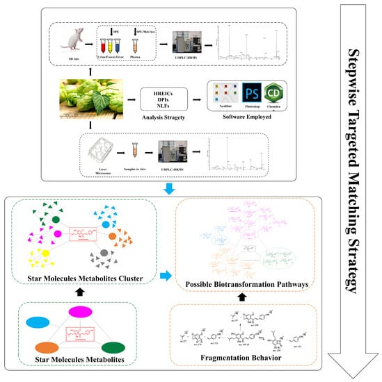 Research on XN’s metabolites in vivo and in vitro has been carried out. For example, Yilmazer M. et al. have discovered that XN can be biotransformed to glucuronides, hydroxylated metabolites, and cyclic dehydro-metabolites in rats and human liver microsomes [13,14]. Investigations using human liver microsomes showed that hydroxylation of a prenyl methyl group is the primary route of the oxidative metabolism, forming hydroxylated metabolites of XN [15]. XN can also be converted to desmethylxanthohumol (DMX) directly [16]. When XN was fed to rats at a dose of 1000 mg/kg body weight, feces was the major route of excretion [17,18], where 22 XN metabolites were identified [19]. Although the metabolism of XN has been reported, it has only been detected in a few metabolites. There were shortages in comprehensive descriptions of XN’s metabolites and their related descriptions in the above analysis.
