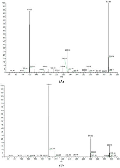 In order to better characterize the metabolites of rats in vivo and in vitro and provide theoretical support for the following rapid analysis, DPIs, such as CO, CH3, and CH3OH, and NLFs, such as m/z 233, m/z 119, and m/z 249 of XN, were summarized on the basis of the mass spectrometric cracking rules reported in the literature and the cracking information of reference substances. XN yielded its [M + H]+ and [M − H]− ions at m/z 355.15323 and m/z 353.13861, respectively, in the ESI-MS2 spectra. The ESI-MS/MS spectra of XN are shown in Figure 4: (1) Important fragment ions were formed by the retro Diels–Alder (RDA) reaction, yielding a pair of complementary product ions at m/z 233 (the A ring) and m/z 119 (the B ring) [17]. Fragment ions such as those at m/z 189, shown by the loss of CO2, and m/z 93 showed that RDA reaction cracking further occurred. A fragment ion at m/z 218 was generated due to the loss of the CH3 at m/z 233; and (2) the formation of fragment ions at m/z 323 and m/z 338 was 30 Da and 15 Da smaller than XN, respectively, indicating the reaction of demethoxylation and demethylation took place. Based on the preliminary judgment of the addition and subtraction of characteristic fragments such as m/z 353 ± nx, m/z 233 ± nx, m/z 299 ± nx, m/z 179 ± nx, and m/z 249 ± nx (x = molecular weight of substituent groups; n = the number of substituent groups), a rough acquisition of the XN metabolites was initially formulated.