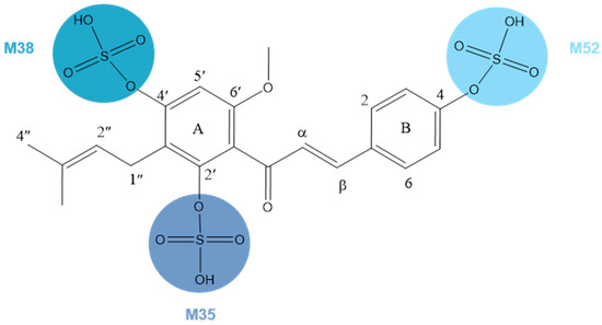 M35, M38, and M52, 80 Da larger than XN, possessed the same theoretical [M + H]+/[M − H]− ions at m/z 435.11191 (C21H23O8S, error ≤ ±5 ppm) and m/z 433.09626 (C21H21O8S, error ≤ ±5 ppm) in both positive and negative ion modes correspondingly. In the ESI-MS/MS spectrum, a neutral loss of 80 Da (m/z 433 → m/z 353) was observed, which indicated the occurrence of a sulfonation reaction. Additionally, the negative ion fragment at m/z 119 as well as the DPIs for sulfation at m/z 80 confirmed our deduction. The same is true for the positive ion fragments, DPIs such as m/z 435, m/z 355, m/z 121, and m/z 235. Furthermore, the substituted sites of SO3 were determined by comparing their ClogP values and retention times. Compounds with a higher ClogP value generally exhibit longer retention times in reversed-phase separation mode [28], thus M35, M38, and M52 were finally deduced as XN-2′-SO3H, XN-4′-SO3H, and XN-4-SO3H, respectively, (Figure 5).