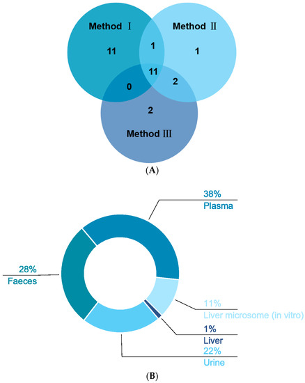 In our study, three methods were used to pretreat the biological samples, and then we applied the same analytical method to detect the signals (see Supplementary Materials). A total of 53 XN metabolites from phases Ⅰ and Ⅱ were screened and identified in vivo and in vitro by using the UHPLC-Q-Exactive Orbitrap method, all of which were based on accurate mass measurements, fragmentation patterns, diagnostic product ions, and literature reports. Plasma samples were characterized as low in content, complex in matrix, and rich in protein; thus, pretreatment played an irreplaceable role in the sample processing. Consequently, protein removal was the top priority. Herein, 23 plasma metabolic products were acquired by SPE, named “method I”. Fifteen metabolites were, respectively, screened by methanol precipitation (method II) and acetonitrile precipitation (method III), as shown in Figure 6A. In general, the three methods mentioned above are widely applied to pretreat the samples in various laboratories at present. Plasma sample preparation approaches are often based on deproteinization using solvents [29] such as acetonitrile and methanol, but detector saturation and ion suppression caused by high concentrations of remaining proteins or species such as phospholipids (PLs) or lysophospholipids (LPLs) are often reported [30]. Meanwhile, we adopted the method of SPE to process biological samples, enriching the target substance and removing the impurities before instrumental analysis, aiming to improve analytical sensitivity and reduce damage to the instrument [31,32]. As we have seen, the number of metabolites by SPE was greater than that by methods Ⅱ and Ⅲ, which might indicate that the SPE cartridge could enrich these kinds of metabolites. Based on the results, it could be inferred that the majority of the metabolites were obtained by method I after the same detection analysis, which showed that the SPE cartridge was the optimal choice for plasma sample enrichment and purification. After the sample was concentrated by the SPE cartridge, more response signals could be detected in mass spectrometry, which provided a certain research basis for the further study of biological samples.