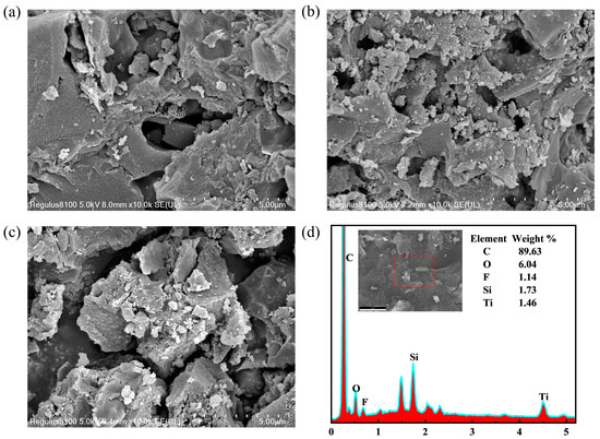 The microstructures and morphologies of the synthetic samples (AC, TiO2/AC, and F-Si-TiO2/AC) were studied using SEM. Figure 1 shows that the surface of pure AC was irregular and exhibited developed porosity. As for the TiO2/AC samples, nano-TiO2 particles were not uniformly attached onto the AC surface with some agglomerations observed. Obviously, loading TiO2 onto AC helped to reduce the agglomeration of TiO2, thereby promoting the photocatalytic activity. In addition, a large number of nanoscale pores and cracks on the surface of AC were occupied by TiO2 and F-Si-TiO2, resulting in a reduction in the specific surface area of the composite [32]. Such observation is consistent with the nitrogen adsorption and pore size distribution characterization results. To further analyze the elemental composition, the relevant regions of F-Si-TiO2/AC were studied by EDS mapping. As shown in Figure 1d, the relative abundances of C, O, Si, Ti, and F were about 89.63, 6.04, 1.73, 1.46, and 1.14 wt%, respectively. These findings confirm the successful doping of various elements into the material.