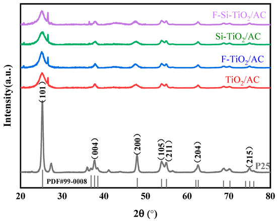 The crystallographic structures of the catalysts were examined using XRD. Figure 2 shows XRD patterns obtained for the five samples (P25, TiO2/AC, F-TiO2/AC, Si-TiO2/AC, and F-Si-TiO2/AC). All of the samples exhibit similar XRD patterns with peaks at 2θ values of 25.3, 37.8, 48.0, 53.9, 55.1, 62.7, and 75.0°, corresponding to the (101), (004), (200), (105), (211), (204), and (215) planes of anatase TiO2 (PDF #99-0008), respectively [32]. Compared with bare TiO2/AC, no other new phases were observed in F-TiO2/AC, Si-TiO2/AC, and F-Si-TiO2/AC, indicating that the F and Si ions were physically adsorbed onto the surface of TiO2 (≡Ti-F and Si-O-Ti) and thus did not change the crystal phase and structure [33]. The crystallite sizes of the different samples based on the (101) peak of the XRD patterns were as follows: TiO2/AC (10.2 nm) > F-Si-TiO2/AC (9.4 nm) = F-TiO2/AC (9.4 nm) = Si-TiO2/AC (8.2 nm) [34,35]. The lower proportion of predominant facet and narrower widths of the XRD peaks in TiO2/AC revealed the good crystallinity (Table 1) [36,37]. Doping F and Si ions will increase the interplanar distance values of the material, which may be caused by F and Si ions doping into the unit cells of the material, resulting in unit cell deformation. The interplanar distance values are in accordance with the values obtained from earlier studies [38]. This result shows that F and Si ion doping can inhibit the growth of the TiO2 grains.