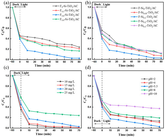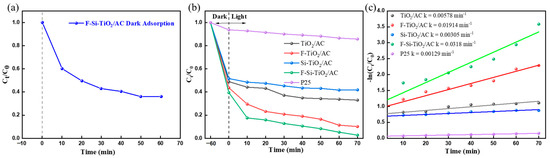 It is necessary to apply a dark adsorption experiment on AC to determine when the adsorption–desorption equilibrium was established. The dark adsorption experiments on F-Si-TiO2/AC were performed for 60 min, and the results are shown in Figure 6a. After 50 min of stirring, the absorbance of the solution did not change any further, which indicates that the sample and contaminant had reached an adsorption equilibrium. Therefore, prior to irradiation with visible light, a 60 min dark adsorption period was applied to all photodegradation processes. The removal efficiency of the material in the dark adsorption process reaches 57%, attributed to the abundant presence of pores, hydroxyl groups, and carbon content on the surface of the AC. These properties enable the material to easily undergo physical or chemical adsorption of pollutants, making the material highly suitable for use in photocatalytic reactions.