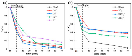 To further evaluate its practical potential, the photocatalytic efficiency of F-Si-TiO2/AC under visible light irradiation in solutions containing different anions and cations was studied (Figure 8).