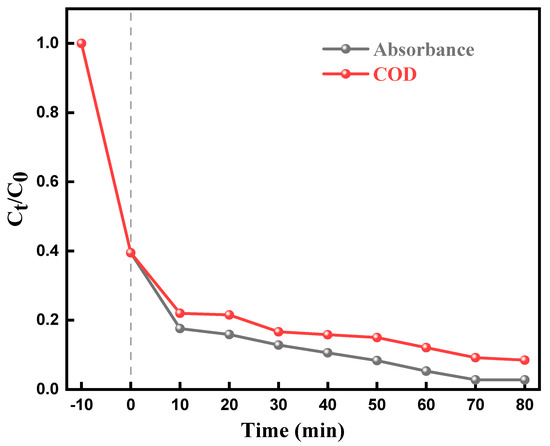 The measurement of the fall in the chemical oxygen demand (COD) of irradiated solutions is usually used to monitor the mineralization of dyes. A consistent reduction in COD with the increasement in the time was noted (Figure 10). The percentage mineralization of MO increased with time, reaching a value of 95.14% after 80 min. The percentage mineralization (84.6%) was lower compared to percentage decolorization (99.97%). The presence of smaller, colorless byproducts formed during the decolorization process may contribute to higher COD values. However, these byproducts do not affect the overall decolorization percentage as they do not add color to the system.