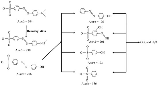 Possible degradation pathways for MO are presented in Figure 13. The peak of m/z = 304 represents the MO molecule after losing Na. Furthermore, the N-C bond of dimethylaminomine is decomposed, resulting in the formation of new products represented by m/z = 290 and 276 [50]. These two intermediates give rise to different products through diverse reaction pathways. A significant portion generates m/z = 196, while a smaller fraction indicates that the aromatic ring cleavage transforms into species with m/z = 254. The oxidative attack results in the elimination of alkyl groups and the formation of m/z = 201 species. The hydroxyl radicals contribute to the creation of m/z = 173 species by attacking azo bonds [49]. The intermediate with m/z of 157 is a deamination product, and finally, all intermediate products are ultimately converted into CO2 and H2O [51].