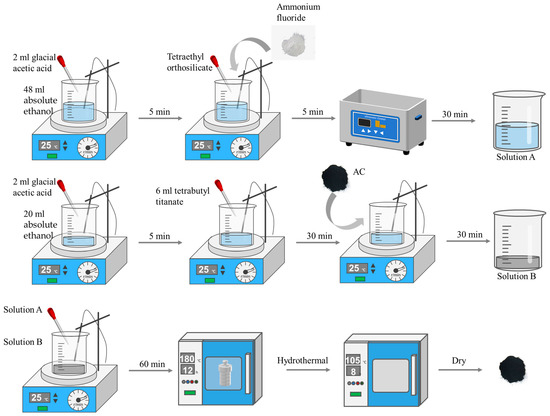 Forty-eight milliliters of absolute ethanol was added to a beaker, and 2.0 mL of glacial acetic acid was added dropwise. Then, ammonium fluoride and tetraethyl orthosilicate were added. The beaker was placed in an ultrasonic cleaner to fully dissolve the ammonium fluoride and tetraethyl orthosilicate to produce solution A. Twenty milliliters of absolute ethanol was poured into another beaker, 2.0 mL of glacial acetic acid was added dropwise, and then 6.8 mL of tetrabutyl titanate was added to the mixed solution of absolute ethanol and glacial acetic acid to produce solution B. One gram of pretreated AC was added to solution B. Solution A was slowly added dropwise to solution B and stirred for 1 h to obtain the precursor solution. The precursor solution was transferred to a Teflon-lined autoclave equipped with a stainless-steel casing for the hydrothermal reaction. The autoclave was naturally cooled to room temperature and centrifuged to collect the pellet, which was then washed with DI water and dried overnight in a convection oven heated at 105 °C for 8 h to obtain F-Si-TiO2/AC. TiO2/AC was prepared without the addition of ammonium fluoride or tetraethyl orthosilicate in solution A. The detailed preparation route is shown in Figure 15.
