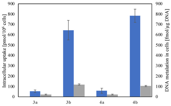 However, the percentual DNA metalation relative to the overall cellular uptake, displayed as the second y-axis and grey columns in Figure 1, was higher for the palladium complexes a than for the platinum complexes b, perhaps following the same rationale.