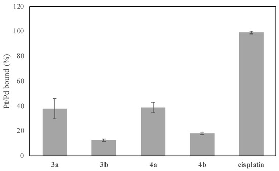 The latter statement was proven in experiments with isolated calf thymus DNA. The results are shown in Figure 2. After 24 h, about 40% of the added palladium complexes 3a and 4a were bound to this DNA, while the platinum analogues 3b and 4b were only 15% and 17% bound, respectively. Cisplatin, used as a positive control, was bound completely after 24 h. This is proof that the palladium complexes a of fludarabine are more “reactive” towards DNA compared to the platinum complexes b. This is likely due to steric reasons, such as the bulkiness and flexibility of the respective complexes, rather than to the metals as such, as is apparent from the high “reactivity” of cisplatin.