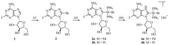 The neutral trans-[(fludarabine–H)Br(PPh3)2]M complexes 3 (a: M = Pd; b: M = Pt) were synthesised in two steps following general protocols, with one additional reaction affording the corresponding cationic N-heterocyclic carbene (NHC) complexes 4 (Scheme 1) [23]. The complexes were characterised by 1H, 13C, 19F, 31P, and 195Pt NMR spectra, ESI high-resolution mass spectrometry, and elemental analysis.