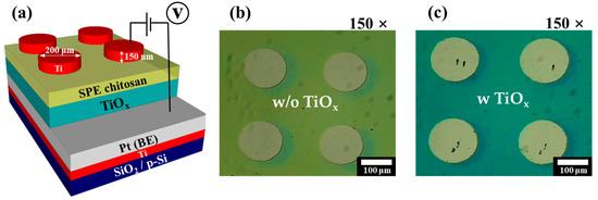 We fabricated highly stable SPE–chitosan memristors with an embedded TiOx layer through MW-assisted oxidation. The process started with cleaning the p-type Si wafer ((110) planes silicon wafers) with a 300 nm-thick thermally grown oxide using a standard Radio Corporation of America (New York, NY, USA) cleaning method. To form the bottom electrode (BE) of the memristor with a MIM structure, a 10 nm-thick Ti adhesive layer and a 100 nm-thick Pt layer were sequentially deposited using an electron beam (E-beam) evaporator deposition system. Then, to form the RS layer, a 150 nm-thick Ti layer was deposited using an E-beam evaporator. Subsequently, TiOx was formed with MW-assisted oxidation under the following conditions: rated power, 1800 W for 10 min and ambient O2, MW frequency, 2.45 GHz. The SPE–chitosan solution was spin-coated on the TiOx layer at 6000 rpm for 30 s, dried in ambient air for 24 h, and oven-baked at 80 °C for 10 min. The thickness of the baked chitosan layer was 80 nm. Finally, a 150 nm-thick and 200 μm diameter Ti top electrode (TE) was deposited onto the RS layer using the E-beam evaporator and a shadow mask. The effect of MW-assisted oxidation was verified by fabricating an SPE–chitosan memristor without the TiOx layer. Figure 1a depicts a schematic diagram of the SPE–chitosan memristor with a TiOx layer developed with MW-assisted oxidation, and Figure 1b,c show optical microscopy images of a SPE–chitosan memristor without and with the TiOx layer, respectively, at a magnification of 150×.