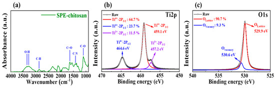 (a) FT-IR spectra of the SPE–chitosan film. XPS peaks of Ti2p (b) and O1s (c) in the TiOx layer developed from MW-assisted oxidation.