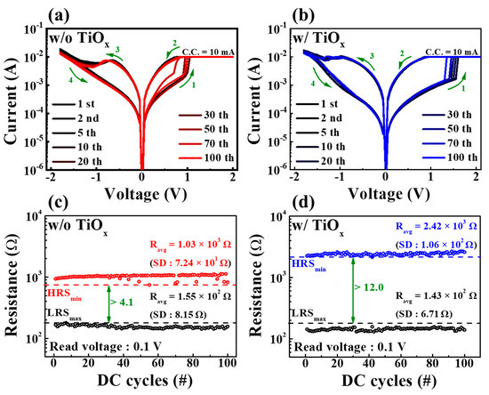 Figure 3a,b depict the endurance characteristics of SPE–chitosan memristors prepared without and with TiOx during 100 DC cycles. These characteristics were measured by applying DC bias while grounding the BE. When the TE voltage was applied in the positive direction (as indicated by green arrow 1), the memristor entered the SET (ON) state, indicating a change in resistance from a high-resistance state (HRS) to a low-resistance state (LRS). Conversely, when the voltage was swept in the negative direction (as indicated by green arrow 3), the device changed its resistance state from LRS to HRS, resulting in a RESET (OFF) operation. Thus, both SPE–chitosan memristors exhibited typical BRS properties. The contact between the electrode and the chitosan electrolyte can be utilized for cation-based electrochemical conversion owing to the redox reaction of mobile ions in the polymer electrolyte [6,29]. The electrochemical metallization reaction significantly affects the RS operation when an electric field is applied to the electrode of the chitosan–TiOx nanocomposite film. Metal electrodes that are reactive to electrochemistry supply and discharge mobility cations allow the development of highly conductive filaments [30]. The HRS and LRS were extracted from repetitive BRS I–V curves at a read voltage of 0.1 V, as shown in Figure 3c,d. For the SPE–chitosan memristor without TiOx, the average resistance values of the HRS and LRS were 1.03 × 103 Ω and 1.55 × 102 Ω, respectively, with standard deviations (SDs) of 7.24 × 101 Ω and 8.15 Ω. In contrast, the average resistance values of the HRS and LRS for the SPE–chitosan memristor with embedded TiOx were 2.42 × 103 Ω and 1.43 × 102 Ω, respectively, with SDs of 1.06 × 102 Ω and 6.71 Ω. This indicates that the SPE–chitosan memristor with TiOx has a larger RS memory window and lower SD than the one without TiOx. Furthermore, the RS window, defined as the minimum HRS/maximum LRS, increased from 4.1 to 12.0 due to the embedded TiOx. This can be attributed to the abundant oxygen lattice and ions in TiOx, leading to a stable RS operation and higher HRS, resulting in a larger memory window [31].