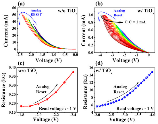 Analog RESET process for SPE–chitosan memristors without (a) and with (b) TiOx. Graphs (c,d) show the corresponding resistances extracted at a read voltage of −1 V.