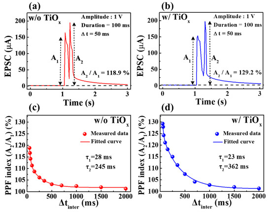 Neural facilitation, which is a dynamic increase in a transporter level and the decoding of biological information, such as visual or auditory data, is an important concept in biological neuroscience. PPF is a typical property of short-term synaptic plasticity and a form of neural facilitation, whereby the second pre-synaptic spike amplifies the first post-synaptic spike. Depending on the time interval (∆tinter) between two successive pre-synaptic spikes, the second synaptic spike causes a larger excitatory post-synaptic current (EPSC) for PPF. The proton transfer ions moved by the first spike accumulate between the electrolyte and the interface. At short ∆tinter, mobile protons accumulate continuously at the interface because they have insufficient time to return to their initial position [33,34]. Figure 5a,b depict the EPSC responses triggered by paired pre-synaptic spikes with an amplitude of 1 V and a duration of 100 ms applied at 50 ms intervals of SPE–chitosan memristors without and with TiOx, respectively. Both memristors showed a higher response in the second EPSC (A2) than in the first (A1), with the SPE–chitosan memristor with TiOx exhibiting a larger EPSC than the one without. The PPF index, calculated as the ratio of the EPSC peak amplitudes (A2/A1), is shown in Figure 5c,d as a function of ∆tinter. The PPF index increases for short ∆tinter and decreases for long ∆tinter, mimicking a biological synaptic response [35]. Notably, the SPE–chitosan memristor with TiOx had a higher PPF index value (~129.2%) than the one without (~118.9%). The PPF index values were fitted using a double-exponential decay function [36]: