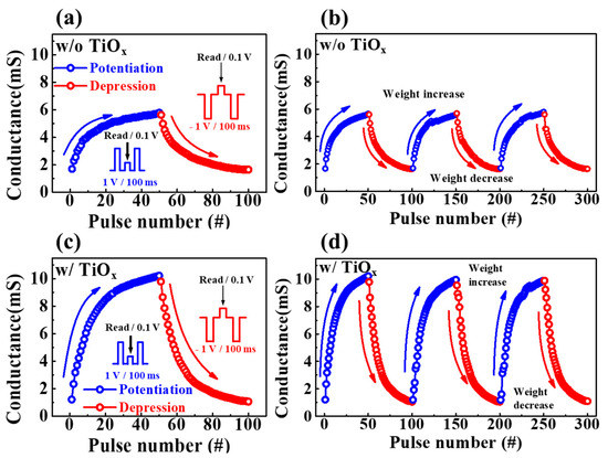 One cycle of 50 potentiation pulses and 50 depression pulses in SPE–chitosan memristors without (a) and with (c) TiOx. Three consecutive cycles of conductance modulation operations were successively performed by applying 300 pulses on SPE–chitosan memristors without (b) and with (d) TiOx.