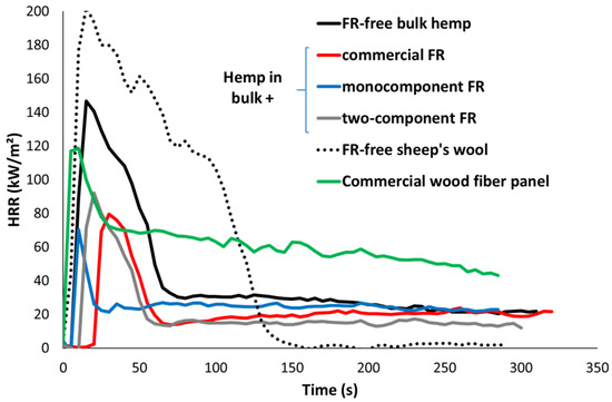 In this study, panels and fibers in bulk exhibit a TTI lower than 25 s (with one exception: sheep’s wool at 25 kW/m2 in the presence of a grid, TTI = 48 s), and the pHRR ranges from 30 to 250 kW/m2 (slightly higher for sheep’s wool at high heat fluxes without grid). The effective heat of combustion after 250 s ranges from 3.5 to 12 kJ/g for lignocellulosic fibers and panels, depending on the flame-retardant systems. The value is slightly higher (15–16 kJ/g) for sheep’s wool. Note that the values for FR free materials (hemp, wood, sheep’s wool) are close to the heat of complete combustion as reported in the literature [14,15,16].