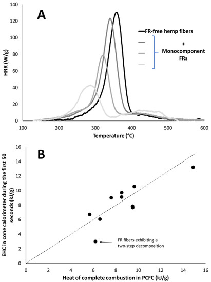 The EHC is calculated over the first 50 s. It ranges from 3 to 16.9 kJ/g depending mainly on the additives used to improve the flame retardancy of fibers. This value is generally close to the effective heat of combustion over the whole test. Moreover, while the cone calorimeter is a well-ventilated test, the EHC is often close to the heat of complete combustion measured in pyrolysis combustion flow calorimetry (PCFC), when no flame inhibitor (typically halogen-based compounds) is used. Figure 4A shows the HRR curves from PCFC. FR free hemp fibers decompose in one apparent step centered at 360 °C. Depending on the flame-retardant system, temperature and peak intensity decrease down to around 280 °C and 40 W/g, respectively. A shoulder at higher temperature can be observed and may correspond to the lignin fraction. It is more apparent for flame retarded fibers, surely because the main decomposition step is shifted to lower temperatures.