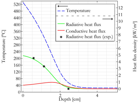 The radiative component of the heat flux (cf. modified Fourier’s law in Equation (8)) resulting from the simulation was plotted for different extinction coefficient values. The value of 450 m⁻¹ leading to the best fit with the experimental data is considered thereafter for the extinction coefficient, as shown in Figure 5. Note that Linteris et al. measured absorption coefficients for several dense polymers and found values from 1000 to 6000 m⁻1 [19]. But these data correspond to bulk polymers while our materials are highly porous. However, the extinction coefficient is the sum of the absorption and scattering coefficients. Therefore, scattering may explain why the extinction coefficient for the hemp panel is only 2 to 13 times smaller than the values reported by Linteris et al., while the density is at least 20 times lower.