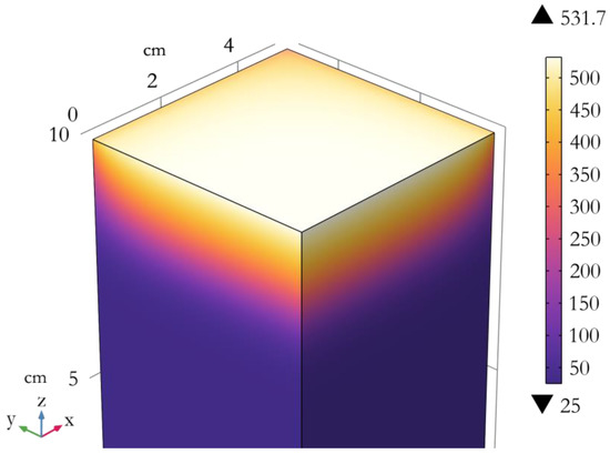 In the case of thermally thin but thick materials, the proposed model assumes that the burning of a limited sample mass is involved at pHRR. To check the reliability of this assumption, a three-dimensional numerical model was implemented with COMSOL Multiphysics® software in order to evaluate the temperature distribution in one sample (namely, the flame retardant-free hemp panel with a density of 43 kg/m3, series B) during a cone calorimeter test. By considering the planar symmetries of the problem and the boundary conditions, the model was simplified as a quarter of the real geometry (i.e., a block of 5 × 5 × 10 cm3). The initial and ambient temperatures were considered to be 25 °C. A cone irradiance of 35 kW/m² was applied to the top surface, considering its heterogenous distribution according to Wilson et al. [30] and a distance of 25 mm between the surface and the base of the cone. The top surface was also considered to undergo a convective heat flux with ambient air assuming a heat transfer coefficient of 10 W/(m2/K). Top and lateral faces were considered to release radiative heat with the environment according to the Stefan–Boltzmann law. Symmetry planes were considered fully insulated. In order to consider the penetration of the cone irradiance in the first centimeters of the sample, the latter was considered as an optically thick semi-transparent media. In order to achieve reasonable computation times, the Rosseland approximation was implemented. It considers that light propagation behaves similarly to heat transfer (when the optical depth is significantly higher than 1) and adds a “radiative” term into the Fourier’s law according to Equation (8).