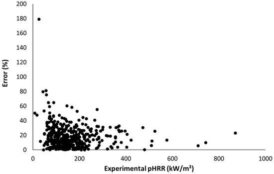 Figure 9 shows that 32.1% of the 430 tests have an error lower than 10%, 64.2% have an error lower than 20%, and 82.8% have an error lower than 30%. Therefore, it can be assumed that the model allows a rough estimation of the pHRR of insulating materials from only a couple of easily available parameters.