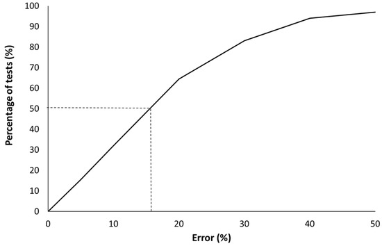 Percentage of tests for which the error is smaller than the indicated value (for example, 50% of the tests exhibit an error lower than 16%).