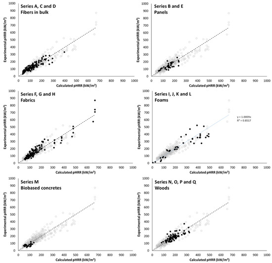 Experimental versus calculated pHRR for all series (for each figure, black points correspond to the considered series).