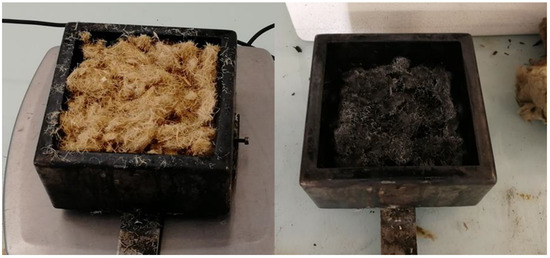 Untreated hemp fibers scattered in the sample holder before (left) and after (right) cone calorimeter test.