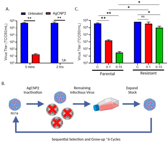 Selection for RV14 that has gained resistance to AgCNP2 inactivation. (A) Liquid solution reactions of RV14 were incubated at room temperature for 5 min or 2 h with buffer alone or with 0.3 mg/mL AgCNP2. Remaining infectivity was determined by TCID50 assay. (B) Schematic diagram of approach to generate AgCNP2-resistant RV14 by sequential rounds of partial inactivation with AgCNP2 as detailed in materials and methods, * indicates times 6 selection cycles. (C) Parental and AgCNP2-selected RV14 were incubated for 2 h with buffer alone, 0.1 mg/mL AgCNP2, or with 0.15 mg/mL AgCNP2. Infectivity was determined by TCID50 assay. For all graphs, values are the mean of three independent samples, with error bars representing the standard deviation. Un denotes undetectable and ns indicates no significance. * and ** indicate p-values of <0.05 and <0.01, respectively.
