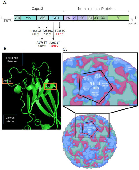 The RNA genomes of parental and AgCNP2-resistant RV14 were sequenced, with reads aligned to the archived RV14 reference sequence [35]. Figure 4A shows a schematic diagram of the RV14 genome with a 5′ end capsid region comprised of four viral capsid proteins VP1, VP2, VP3, and VP4 [36], and a 3′ region composed of non-structural proteins. Figure 4A also shows the location of nucleotide changes between parental and AgCNP2-resistant genomes detected by sequence analysis and their predicted amino acid substitutions. Remarkably, within the ~7000 nucleotide-long genomes, there were only five nucleotide sequence differences found between the parental and AgCNP2-resistant viruses. Three of the five mutations were in the coding region of VP3, but these were silent alterations that did not change the predicted amino acid sequence. Most importantly, two out of the five differences between nucleotide sequences of the RV14 genomes were in the VP1 coding region, resulting in two predicted amino acid alterations as shown in red in Figure 4A: Aspartic acid 91 to Valine (D91V) and Phenylalanine 177 to Leucine (F177L).