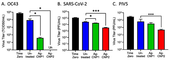 The PIV5 glycoprotein hemagglutinin-neuraminidase (HN) glycoprotein is responsible for binding virions to sialic acid receptors on host cells [32]. To test for AgCNP-mediated disruption of PIV5 receptor binding, reactions were prepared with PIV5 and buffer only, AgCNP2 only, and PIV5 treated with 0.02, 0.075, or 0.2 mg/mL AgCNP2. After incubation, the remaining HA was then tested on RBCs. As shown in Figure 1D, RBC treatment with AgCNP2 alone did not show HA activity (right side, orange bars). By contrast, treatment of PIV5 with 0.075 and 0.02 mg/mL AgCNP2 reduced PIV5 HA titers from ~2000 in the untreated sample to 250 and 200, respectively. These results indicated that AgCNP2 prevented PIV5 from binding to RBC indicator cells in a dose-dependent manner. Taken together, these data indicate that both AgCNP1 and 2 treatment of OC43 and PIV5, respectively, disrupted virus–receptor interactions.