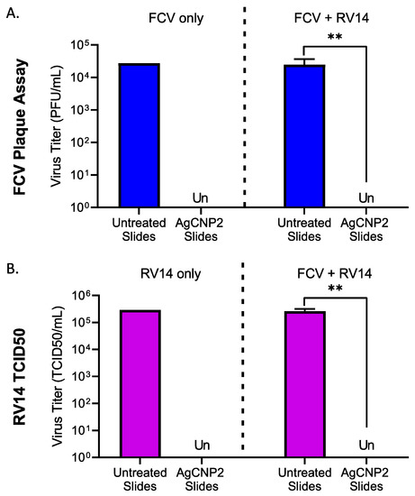 AgCNP2-coated slides inactivate both FCV and RV14 in a mixed virus inoculum as effectively as in individual virus challenges. (A,B) Three sets of slides were left uncoated or coated with 0.1 mg AgCNP2 and dried. One set of slides was challenged individually with ~5 × 104 PFU of FCV, and a second set was challenged individually with ~1 × 105 TCID50 units of RV14. A third slide set received a mixed inoculum of both FCV and RV14 at the above doses. After 2 h at room temperature, slides were vortexed in media and remaining infectious virus was collected. FCV titers were determined by plaque assay on CRFK which do not support RV14 infections. Remaining RV14 infectivity was determined by TCID50 assays on HeLa cells which do not support FCV infections. Individual FCV- and RV14-only virus controls were performed as single samples. Mixed inoculum values are the mean of three independent samples, with error bars representing the standard deviation. Un denotes undetectable and ** indicates p-value < 0.01 comparing untreated to indicated treatment.