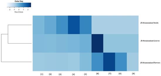 Heatmap analysis of D. stramonium flower, leaf and seed extracts. The clustering of samples is presented to select the best extract with large biological activities and with low cytotoxicity effect. (1) DPPH (IC50), (2) FRAP (EC50), (3) ABTS (IC50), (4) anti-inflammatory activity (IC50), (5) cytotoxicity effect (LC50), (6) MIC against S. aureus ATCC 6538, (7) MIC against MRSA, (8) MIC against Bacillus cereus ATCC 14579, and (9) MIC against Enterococcus feacalis ATCC 29212.