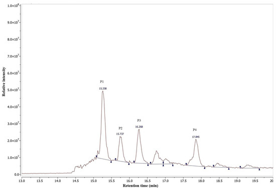 RP-HPLC chromatogram of RP5 fraction of D. stramonium flower extract. P1, P2, P3, and P4 subfractions with anti-inflammatory activity.