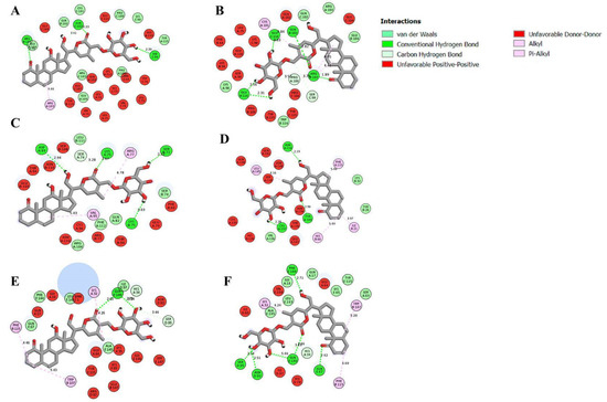 Docked poses of IL-6 with (A) 12α-hydroxydaturametelin B (daturamalakoside B), (B) daturametelin B, IL-6R with (C) 12α-hydroxydaturametelin B (daturamalakoside B), (D) daturametelin B and IL-6-IL-6R complex with (E) 12α-hydroxydaturametelin B (daturamalakoside B), (F) daturametelin B. The structural graphics were generated using Discovery Studio 2021.