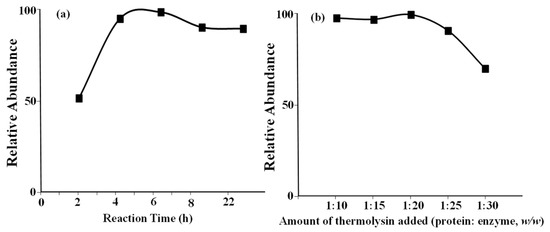 One of the favored cleavage sites is the N-terminus of position P1′, Ile66 in this case. However, thermolytic cleavage is blocked when proline is located at position P2′, as reported previously [25], e.g., Pro67 for A2 protein. This is the reason that different lengths of A1 and A2 peptides were observed. Similarly, cleavage of Ile74 was not blocked because of the presence of Pro75. Therefore, no other peptide in the Pro/His67 area was observed in this study. The digestion experimental conditions were carefully optimized using a β-casein standard. The relative abundances of A1 peptide, which was generated after enzyme digestion, against reaction time, and the amount of thermolysin are shown in Figure 1a,b, respectively. When the incubation time and amount of thermolysin added were optimized, the same trends for the A2 peptide level were also observed under the same condition. Finally, a digestion reaction time of 4 h and a protein to enzyme ratio of 1:20 were adopted for the experiments. Under optimized digestion conditions, no intact proteins were detected using the mass spectrometer, which proved that the reaction had been completed.