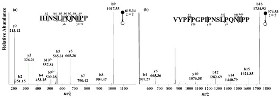 With an LC-MS method, A1 and A2 peptides could be determined based on their retention times and exact masses, distinguishing β-CN variants. However, false signals could be generated if an isobaric peptide with the same retention time is present in the digestion solution sample. Alternatively, tandem mass spectrometry can further increase the specificity of the LC-MS method, and thus improve the reliability of the result. In this study, the characteristic peptides containing varied amino acid moieties at the 67th position were subjected to fragmentation upon collision-induced dissociation. The fragmental ions were clearly annotated, as shown in Figure 4, and are consistent with the theoretical MS/MS data.