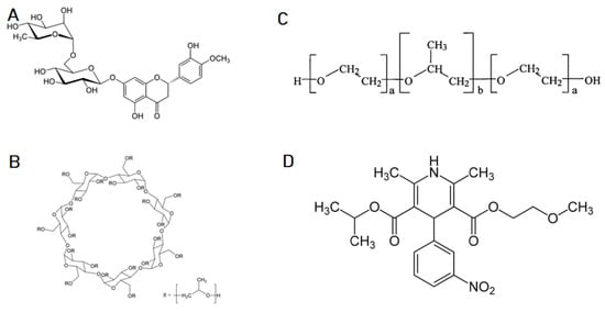 Structural formulas: (A) Hesperidin, (B) 2-Hydroxypropyl-β-cyclodextrin, (C) Pluronic F127, (D) Soluplus.