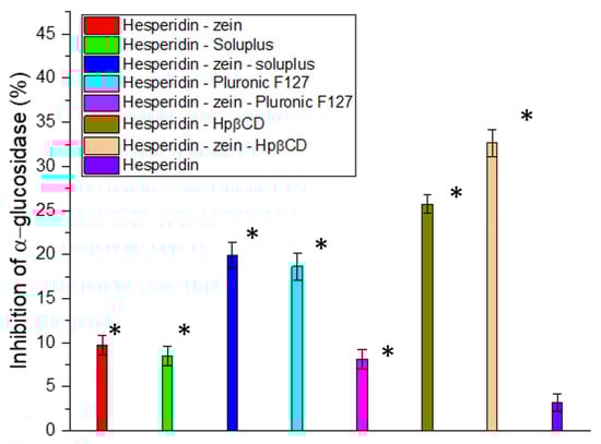 Inhibition of α-Glucosidase by hesperidin, and the resulting double and triple systems. Data expressed as mean ± SD; *—significance with p ≤ 0.05.