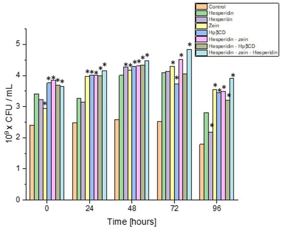 Growth of the Lactiplantibacillus plantarum 299v strain exposed to HES and the components of the tested triple system, *—significance with p ≤ 0.05.