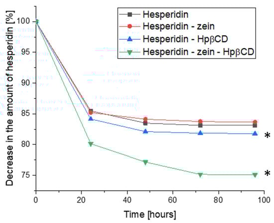 Quantitative change in hesperidin during the cultivation period as a loss of initial concentration (%), *—significance with p ≤ 0.05.