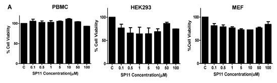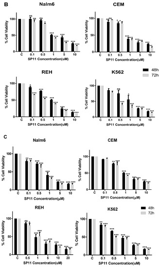 2.2. SP11 Induces Cytotoxicity in Various Leukemia Cell Lines with Least Effect on Normal Cells