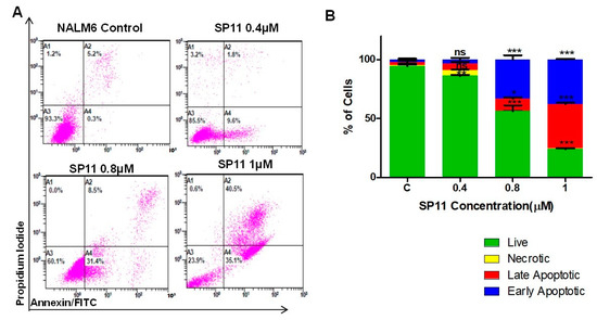 2.3. SP11 Treatment Induces Apoptosis Rather Than Necrosis in Leukemic Cells