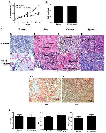 2.5. SP11 Reduced Tumor Burden with Minimal Toxicity and Enhanced Bioavailability