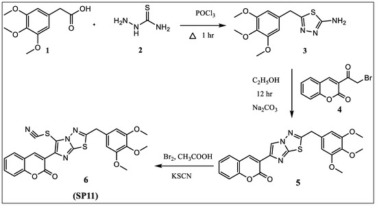 4.2. Synthesis of 3-(5-Thiocyanato-2-(3,4,5-trimethoxybenzyl)imidazo [2,1-b][1,3,4]thiadiazol-6-yl-2H-chromen-2-one 6 (SP11)