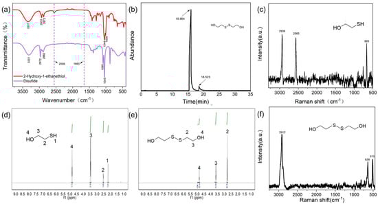 Characterization of 2-Hydroxy-1-ethanethiol and the synthesized SS in the work: (a) near-infrared spectra of 2-Hydroxy-1-ethanethiol and SS; (b) gas chromatography spectrum of SS; (c) Raman spectrum of 2-Hydroxy-1-ethanethiol; (d) nuclear magnetic resonance spectrum of 2-Hydroxy-1-ethanethiol; (e) nuclear magnetic resonance spectrum of SS; (f) Raman spectrum of SS.