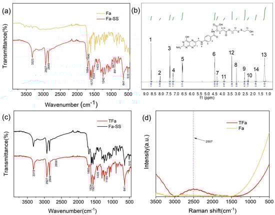 Characterization of FA and the synthesized Fa-SS and TFa in this work. (a) Near-infrared spectra of FA and Fa-SS. (b) Nuclear magnetic resonance spectrum of Fa-SS. (c) Near-infrared spectra of Fa-SS and TFa; (d) Raman spectra of FA and TFa.