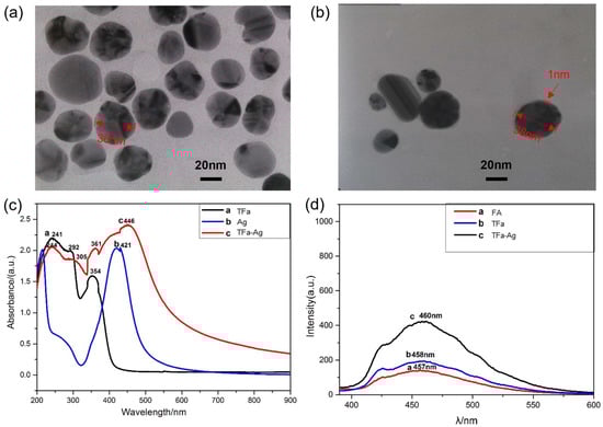 (a) TEM image of AgNPs. (b) TEM image of TFa-modified AgNPs. (c) UV-Vis spectra of samples. (d) Fluorescent emission spectra of samples.