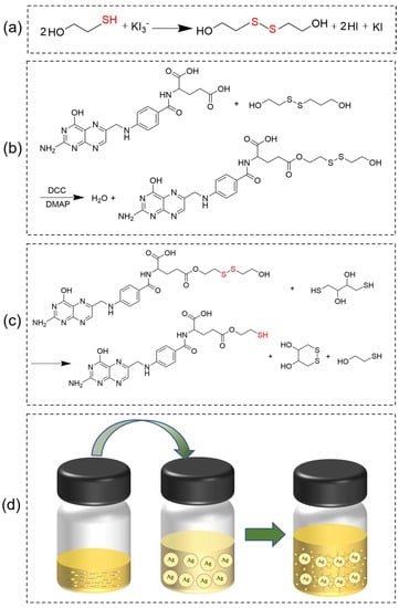 For the past decade, folic acid (FA) [1,2,3] has been attracting considerable attention in the fields of targeted drug delivery [4,5] and cancer therapy [6] because of its tumor-targeting capability and low cost. FA can be integrated with a diverse range of nanomaterials, including metal nanoparticles [7,8,9], polymers [10,11], chitosan [3], liposomes [12], and oxides [13], to fabricate various drug delivery systems. FA is an important biological ligand [14] and a broad-spectrum targeted biological reagent whose receptor (FRα) [15,16] is overexpressed in most tumor tissues [17,18]. Shengnan Huang et al. [19] reported a gene therapy combined with photothermal therapy employing FA-modified gold nanocages for the delivery of anti-MIR-181B and achieved good results in treating hepatocellular carcinoma. Xiaoyu Wang and coworkers [20] fabricated a novel fluorescent probe for detecting cancer cells by combining folic acid-conjugated poly(l-lysine) (FA-PLL) with fluorescent gold nanoclusters. Wu Y and colleagues [21] prepared FA-modified laponite nanodisks for targeted anticancer drug delivery utilizing 3-aminopropy-ldimethylethoxysilane as a linker. To date, FA is generally bound to main matrices through a bridge of bifunctional macromolecules (such as PEG (Thiol)2, etc.) or amino acids carrying sulfhydryl groups [22,23]. The aforementioned complex processes resulted in lower purity and high costs. It is worth noting that the length and structure of the linker are key factors in the interaction of folic acid with FR on the cell surface, and it is meaningful to develop new folate derivatives of different molecular chain lengths to determine the types of folate derivatives suitable for biological applications as well as their targeting performance, biocompatibility, and cell toxicity. Sulfhydryl [24] is a bioactive substance that can be bio-coupled with drug carrier molecules such as proteins, DNA, or metal nanoprobes [25], so conceiving the small molecule thiolated folic acid (TFa) with different molecular chain lengths and structures would greatly facilitate applications of FA [26]. It is the key to introducing the sulfhydryl group into the FA molecule chain because of its high chemical activity, which is higher than that of the hydroxyl and amine groups. It is a good scheme to modify folic acid with disulfide (SS) and then break the disulfide bond to form TFa [27,28]. To date, disulfide is generally synthesized by oxidizing sulfides, which is carried out in organic solvents employing transition metal catalysts and hydrogen peroxide, chlorine, or oxygen as oxidants. M.M. Khodaei et al. [29] oxidized 2-Hydroxy-1-ethanethiol to SS using acetonitrile as a solvent, Bi (NO3)3 as a catalyst, and air as an oxidant. Makoto Oba et al. [30] reported the oxidation of 2-Hydroxy-1-ethanethiol to SS, adopting dichloromethane as a solvent and bis(4-methoxyphenyl) telluride as a catalyst. The above oxidants are stronger to lead to byproducts such as isethionate, and the residue of the solvent and the heavy metal catalysts is also not conducive to subsequent biosynthesis. Moreover, the purity of commercial SS is only about 90%, which is not suitable for the synthesis of TFa because produced folic acid derivatives are very difficult to separate and purify. Zeynizadeh Behzad reported his work on the oxidative coupling of thiols to disulfides, employing iodine as an oxidant and wet acetonitrile as a solvent, and obtained a higher yield of 94% [31]. Here, we developed a green routine using iodine as the oxidant and pure water as the solvent to prepare S-S-containing diol without catalysts, which was helpful for the purification of subsequent products. The purity of the obtained S-S-containing diol was 99.44%. Then, SS-modified FA (Fa-SS) was prepared through esterification, and thiolated folate (TFa) was finally synthesized by breaking the disulfide bond of Fa-SS using dithiothreitol (DTT) as a reductant. The purity of the synthesized TFa was higher than 98.20%. Further, the resultant TFa was used to modify silver nanoparticles, and the results showed that TFa could be easily bonded to noble metal particle surfaces such as Ag, Au, etc.